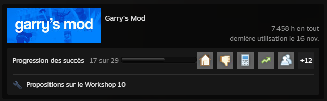 Sa dépend des semaines, sur 4 semaines, il y a 2 semaines ou je suis disponible, touts les jours, toute heure et 2 autres semaine ou je suis dispo touts les jours après 17h15 appart en weekend. Ces 4 semaines sont dispersé et le plus souvent c'est 1 semaine sur deux. Dans touts les cas, je suis dispo tout les jours.Expérience en jeuHeures de jeu sur Garry’s Mod : 7.458h